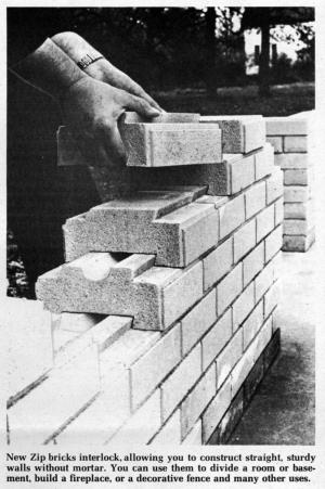 Anybody can put up a brick wall that's straight, strong and attractive with this new "mortarless" masonry system. Bricks are made of molded concrete with a "tongue and groove" design so that they interlock to form a sturdy wall. Available in two sizes- standard 2 1/2 by 8 by 8 in.
