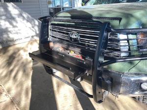 “When the pickup arrived, I realized the side rail toolboxes on my old pickup couldn’t be used due to the new swing-out toolbox design on new Tundras,” says Stephens. “The pickup came with a big grille guard, so I decided to replace the center bar on it with a 36-in. long, 7-in. wide piece of toolbar off an old Deere planter. I cut the top off the toolbar and closed up the ends.