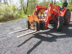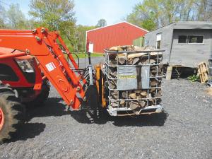 Eric Petrevich, Glen Gardner, N.J., sells firewood to individual homeowners and wholesale markets, delivering the wood in a dump truck. He eliminated a lot of handling by adapting German-made “rotating forks” designed for use on a forklift to his Kioti 75 hp. 4-WD loader tractor. It lets him lift steel totes loaded with firewood over the side of the truck, and rotate them upside down to dump the wood directly into the truck.
