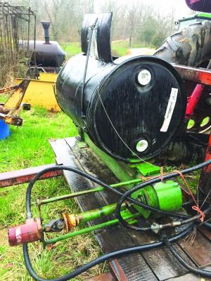 He shortened the conveyor to 6 ft. and bolted it onto a wooden platform that rests on a pair of 3-pt. mounted forks. The conveyor is shaft-driven by a small hydraulic motor that runs off the tractor’s hydraulics. The barrel lays sideways on top of the conveyor, and is bolted to an angle iron bracket welded to the conveyor.