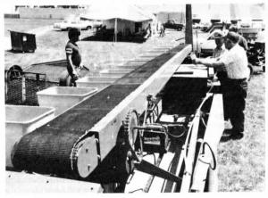 Oftedal got the 20-ft. conveyor from a feed plant where it had been used to handle feed sacks. It mounts 6 in. above and 6 in. ahead of the seed boxes, about where dry fertilizer boxes would normally mount, and is battery-driven by a starter motor that's geared down to run the conveyor at a "slow creep" of about 1/ 2 revolution every two minutes.