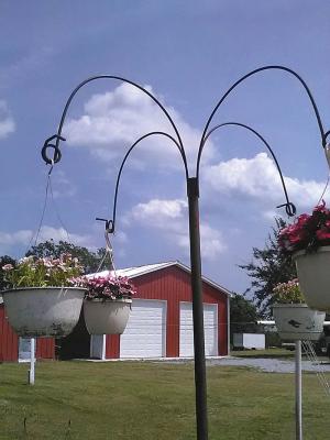 Flowerpot Hanger FARM HOME Novelty Items A few years ago I bought this home-built flowerpot hanger at an auction and placed it in my yard I don’t know who made it but it’s quite unique and pretty The four curved steel teeth are off an old 2-wheeled horsedrawn dump hay rake and still have the original attachment ring The teeth are welded to an 8-ft metal post anchored about 2 ft in the ground Preston Williams Victoria Va ph 434 321-3375