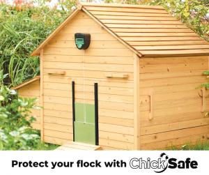ChickSafe door openers are made in the U.K. and start at $99.99. A complete Advance opener with door kit is priced at $219.99 but was on sale midsummer at $199.99. They are only available online or from the Brinsea Products catalog. They come with 4 AA batteries expected to last a year or more.