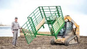 With a quick-attach mount, the Calf-Catcher works with a skid steer loader or 3-pt. hitch and is designed to drop down over a newborn calf. Once it is inside, the producer can move into the 5 by 6-ft. box and let down the Marine-grade plywood floor to vaccinate, tag and castrate the calf or move it.
