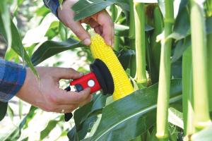 By pressing the device against a ripening corn cob, you can test the corn kernel moisture in less than a minute. “This device is simple to use, accurate and affordable,” says Goldring.