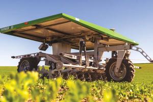The four solar panels deliver up to 20 kWh per day. The battery pack is sized to provide 24-hr. operation for the electric-powered seeder/weeder. If it runs out of power at night, the FD20 simply stops where it is and waits for daylight to reenergize and continue operation.
