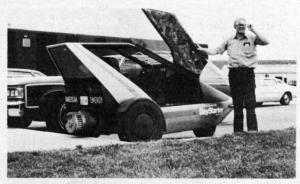More than half of the vehicle's 2,220 lbs is in the 13 batteries, which ride only 8 in. off the ground. The car's Volkswagen transmission has four speeds forward and one in reverse. Windows are plexiglass and the body aluminum. The car's electric motor was obtained from a truck company that had used it in an experimental electric truck. Heat given off by the batteries is directed inside to keep the driver comfortable in cold weather.