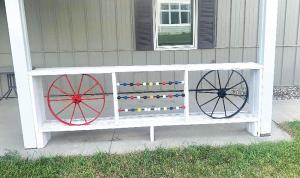 Then, it was on to collect a couple of wheels off an old John Deere press drill for additional decoration. Gleason painted a bunch of the golf balls, drilled holes in the middle, and put a runner rod through them.
