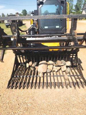 “It gathers the rocks in without the dirt and other trash you get with most rock pickers,” says Imhoff. “The bats come within an inch and a half of the front of the slotted bucket. They grab anything larger than that. If a rock is too big, I raise the reel and dig it out with the bucket.”