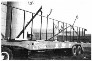 An 8-ft. high steel rail runs down the middle of the 53-ft. long, 8-ft. wide trailer. The trailer accommodates 34 5 1/2 by 6-ft. bales or 38 to 42 5-ft. bales. The floor slopes in toward the center so bales stay on without tie-downs. Outrigger "cradles" along the sides slide out and lock in place when hauling 6-ft. bales.