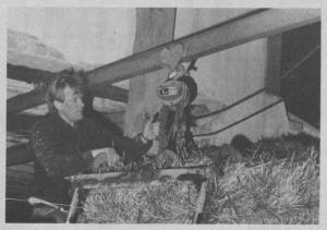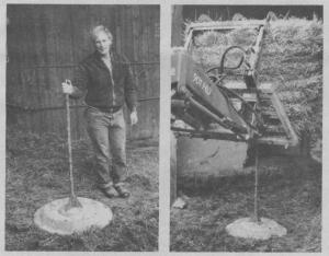 3. The spear tip is hooked, via a clevis-type hook with a pin running through a hole near the tip of the spear, to a chain-operated winch and "come along" which rides on an over-head rail. Ake simply attaches the winch hook to the spear, winches the big bale off the floor, then manually moves it via the overhead rail throughout his 140 cow stanchion barn. He pushes the bale with one hand and uses the other to turn the bale and "peel off" a portion for each cow.
