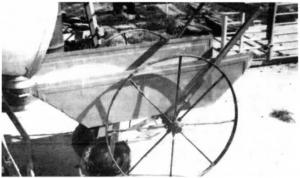 The 2-ft. wide cart is made from sheet metal from an old billboard sign and is equipped with big 2 1/2-ft. dia. steel wheels on back and 10-in. dia. solid rubber wheels in front. It's supported by a steel frame that's hinged just above the front wheels. To dump a load, Guy lifts up on the handles.