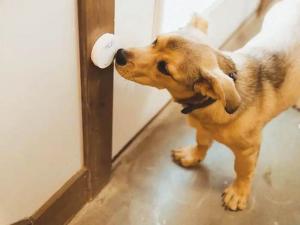 The Smart Bell 2.0 uses wireless technology with two components—an activator/transmitter and a receiver. The transmitter buttons are easy to install with 3M command strips (drywall anchors and screws are included) and are weatherproof, allowing for indoor or outdoor use so dogs can indicate a readiness to return indoors. The transmitter is placed on or near the door and activated with a gentle touch (.75 lbs. pressure).