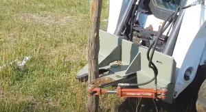 What makes the post-puller different from others is its jaws with sawtooth edges. The operator drives up to the post, and a hydraulic cylinder clamps the post between the jaws.