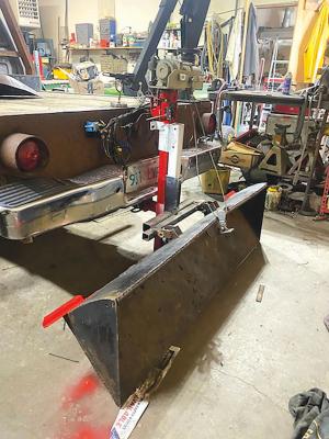 The bucket is attached to the bottom of the hitch and is slightly wider than 5 ft. to clear the snow past the width of the truck’s axle.