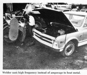 A special alternator and an electronic unit make up the unit which mounts under the hood. The welder reportedly doesn't cause engine overheating problems, even if operated continuously for long periods of time. It's equipped with an outlet so you can run power tools, or use it to charge batteries.