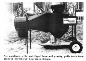 Grain is augered into the top of the Air Kleen cleaner. There, a 1/2 hp. motor creates a circular flow of air which sets up centrifugal motion in the column of grain. The light fines and trash move to the outside of the column where a 3 hp. fan can pull the debris away. Gravity pulls the heavier grain down through an exit port where it can run into a dump hopper.
