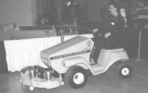 The front-wheel drive 9620 uses six 6-volt deep cycle batteries to power three direct-drive motors mounted on top of a 3-blade, 44-in. deck. It combines near-zero turn capability with the convenience of in-finitely variable speed control. A joystick is used to steer the unit.