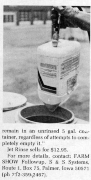 "The importance of rinsing the chemical container is to permit total usage of material inside the can, and also the safety factor involved with chemicals left in cars. Many landfills and salvage yards will not accept empty chemical cans that have not been properly rinsed," Siefken points out. "Studies at Oregon State University indicate that as much as 6 oz. of chemical - worth up to $3 - remain in an unrinsed 5 gal. conitainer, regardless of attempts to completely empty it) Jet Rinse sells for $12.95.