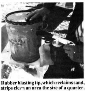 The blaster consists of a gun handle that's fitted with a 1-quart sand canister and a special rubber tip that's designed to reclaim most of the sand used for blasting. Blaster hooks up to a conventional air hose, using normal tire-inflation pressure. To use, you hold the rubber blasting tip up tight against whatever's being cleaned and it'll strip clean an area a little bigger than a quarter. Sand is trapped within the rubber tip. When air pressure is turned off, it drops into a cloth bag for reuse.