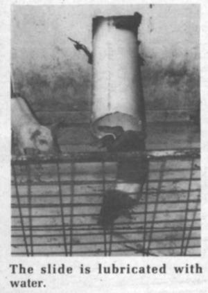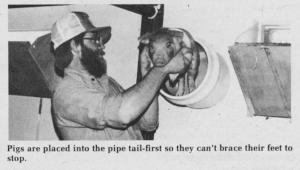 To make the pigs slide through the pipe easier, water is used to dampen the slide for the first pig. The couple puts the pigs in the pipe tail-first so they can't brace their feet to stop themselves.