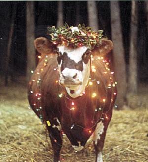 This past year the cow - named Pumpkin Petunia - sported a colorful array of Christmas lights topped off by a holly wreath. Pumpkin is a patient, good-natured animal that doesn't seem to mind donning the lights occasionally, notes White.