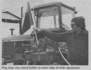 Leland Schultz, extension safety specialist at the University of Minnesota, told FARM SHOW that he thinks the safety flag idea is a good one, provided other safety precautions are also observed. "Standard safety recommendations call for flashing warning lights on the tractor and reflectors front and back. When hauling wide machinery, there should be a warning vehicle in front of the tractor and one in back and both should have their flashing warning lights on."