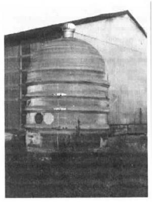 The Barnes ibuilt the pesticide storage facility out of a salvaged 5,000-gal. under-ground fiberglass fuel tank. After thoroughly cleaning out the tank, Barrie cut one end of the 7-ft. dia. tank off and upended the tank like a silo. It sits on a 10-in. thick seamless concrete pad with a 6-in. sill around it to contain any chemical spills. A hinged door cut in the side of the tank permits loading and unloading 13-gal. totes and mini bulk pesticide containers used on the Barnes' 800-acre farm. The door can be secured with latches and a lock. A turbine on top provides ventilation and warning signs are clearly visible on the outside.