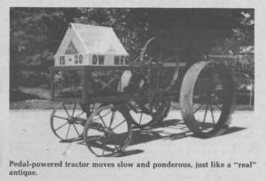 "More and more people come to threshing bees and engine shows with little working knowledge of the machines they see. They're impressed wth the size and noise but can't really appreciate the skill, hard work and knowledge that goes into restoring and operating these old engines," says Dick Wenkel, who built a pedal-powered "training tractor" that demonstrates some of the principles that drive many old antique tractors.