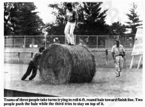 Teams of three people took turns trying to roll a 6-ft. round bale toward a finish line. Two people pushed the bale while the third tried to stay on top of it. If he fell off, he had to get back on top before they could start the bale rolling again.