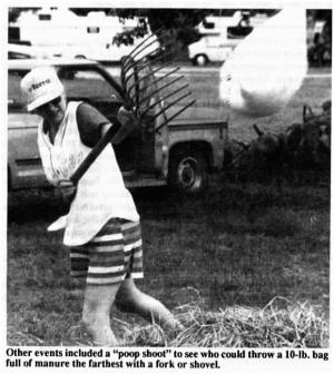 Other events included a square bale throwing contest, a "poop shoot" (to see who could throw a 10-lb. bag full of manure the farthest with a shovel), the "farmer's walk" (participants hold a tractor weight in each hand and walk to the finish line as fast as possible), and a "to the mill" relay (a team of four must haul 4 grain hogs "to market". One participant ties the bags, one loads them into a wagon, one drives tractor and wagon to the "mill", and one unties them. The tractor driver has to go through an obstacle course to get to the mill and then back up to a loading dock. Once the bags are untied, he races for home - with the tractor in low range). -The mill relay was the most popular event because many entrants had never driven a tractor or tied a grain bag," says Tanner.
