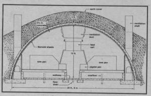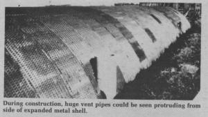 Key to the success of the 60-crate, 150 by 30-ft. farrowing barn is the half-circle design that uses a new expanded metal material made by United States Gypsum, Chicago, Ill. The 1/16-in. thick sheets are set up in a half-circle and 1 1/2-in. of concrete is sprayed on the inside. Then, 5 1/2 in. of concrete is sprayed on the outside. With no further support inside, and 3 to 12 ft. of dirt covering over the sides and top, the building becomes nearly impossible to crush and will support even the heaviest tractors and other equipment driven over the top of it.