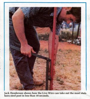 "It'll run circles around a tractormounted pulley," said Jack Henderson, national distributor, as he pounded a post 4 ft. into the ground to show FARM SHOW how slick the "Live Wire" pulley works. In less than 8 seconds, he had the post out of the ground.