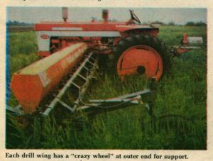 The interseeder takes a 25-ft. swath and plants soybeans in 15-in. rows. It's mounted on a 560 International tractor set for 75 in. wheel tread and equipped with 12.4 by 38-in. tires on the rear, and 7.50 by 16 mono-rib tires up front. Planter boxes, salvaged from a Deere model B drill, hold 25 bu. of beans (with side extensions). Drill wings on each side of the tractor are hinged to follow slopes and have a "crazy wheel" at the outer end (equipped with a 6.00 by 16 mono-rib tires) for support. The mono-rib tires help part the wheat, minimizing damage as they roll through the field. The drills fold back for transport and can easily be removed by unfastening just two bolts.