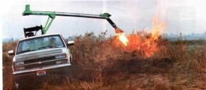 The "Ditch Dragon" consists of a steel frame that supports an 18-ft long steel tube equipped with an electric blower on one end and a nozzle at the other. The blower pushes air toward the nozzle while a pump delivers diesel fuel from a 552ga1: barrel to an atomizer mounted on the nozzle. A pair of igniters are mounted on the nozzle and are activated by a 4,000-watt generator. The unit mounts in the bed of a pickup or can be 3-pt. mounted on a tractor.