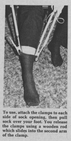 But now, thanks to the new Rielyn Foot Butler, designed by Albert Reick and Harry Lynch, Oakville, Ont., people with problems can once again pull on their own socks.