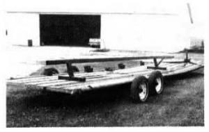 We have a few narrow bridges to cross when traveling between fields with our combine and we can't get across with the header in place. I already had this low implement tailer that was not used during harvest so I decided to adapt it to carry a header using a few pieces of square tubing. Works very well and is easy to remove when harvest is over. (Curt Meaner, Colfax, Ill. 61728 ph 309 7234225)