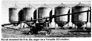 The Holdfast, Sask., farmer mounted a 60-ft. long Sakundiak auger on a 103 Versa-tile swather. "I was at an auction sale and in looking over the machinery, spotted the swather. After examining it I decided it was just what I needed to carry my auger so I bought it for $900," says Myrah.