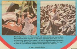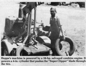 Hoppe charges tire shops, auto parts stores, and garages a fee to dump used tires on his farm. Then he runs them through his "Super Clipper" hydraulic-powered tire cutter. It uses a hard-surfaced, blunt-edged blade pushed by a 4-in. hydraulic cylinder through a slot in a cutting table to cut through the tire sidewall. A small piece of tire is punched out with each "cut". A 28-hp. Allis Chalmers combine engine powers hydraulics which push the cutting arm through the tires. It takes just 10 seconds or so to cut a car tire into 3 sections.
