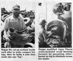 Arnie Hoppe, Miltona, Minn., also sell tires for fuel to other farmers who, like him, burn them in a specially-built outside furnace that burns with "less smoke than an efficient wood burning stove or furnace."