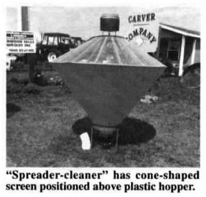 Invented by Gerald Hoppe, St. Clair, Minn., the spreader-cleaner consists of a cone-shaped screen that's positioned above a plastic hopper. The spreader/cleaner mounts just below the top bin opening. Grain is augered into the cylinder and then down across the cone-shaped screen. Chaff, fines, insects and bees' wings fall through the screen, slide down a tube, and exit out-side the bin where they can be loaded into a truck or trailer.