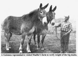 Mueller's attempt to get his huge mules listed in the Guinness book was spearheaded by a friend from Kentucky who was deter-mined to document the fact that they were the world's largest. A Guinn less representative visited the farm to verify the mules' size by weighing them on a certified scale.