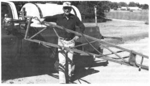 Mid mounted pickup sprayer SPRAYING Miscellaneous 14-6-34 My mid-mounted pickup sprayer subjects the booms to less than one half the movement and road shock of a conventional rear-mounted pickup sprayer. The booms on the sprayer mount on angle iron brackets just behind the cab. In transport they're held in alongside the pickup box. In the field they're allowed to swing freely to their extended position, and are held in place by gravity. The pump and motor are located at the front of the box out of the dust. The sprayer control valve is mounted so that it's easily accessible out the driver's window. (Adolph Anderson, Rt. 1, Box 1, Astoria, S. Dak. 57213)