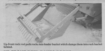 The out-front hydraulic-powered reel, fitted with 4 rows of 1-in. dia. steel tines, works down to 2 or 3 in. below the surface, raking rocks and roots into the rock lifting scoop behind it. As the rock lifter fills up, it dumps to the rear into a solid metal rock bucket. When the bucket fills up, you drive to the rock pile, dump it out the front, and back away.