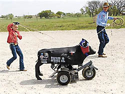 The Sparky Roping Machine has a body made of plastic and rides on a three-wheeled frame. The unit operates on a DC electric motor that runs on batteries, so there's no noise or smoke. The unit comes with a remote start-stop that you keep on the horse's saddle, which enables you to rope by yourself without anyone else operating it for you. The steer will "run" across a roping arena at speeds as high as 20 mph.