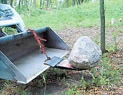 Made of solid steel with military strength welding, the Quick Spade slips on standard skidloader forks and is secured with a chain and binder. (The more expensive model fits on forks or a bucket.)