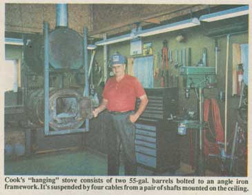 "It doesn't take up any floor space, yet it provides heat right over my work area," says Cook, of Ithaca, Mich. "It makes it easy to keep the floor clean because there's no concentration of wood or ashes like there is with a floor-mounted stove. There's also less of a fire hazard. I had the stove checked out by my insurance agent and made sure it met local fire codes before I built it It takes only a little more than 30 seconds to raise and lower it The only time I lower the stove is to load wood and remove ashes.