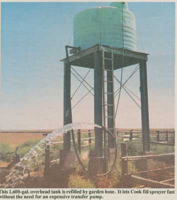 "I came up with the idea because I didn't want to spend the money for a transfer pump that I would only use once a year," says Cook. "My water tower is trouble-free and it takes only 15 to 20 min. to completely drain the tower's 1,600-gal. poly tank. I couldn't have justified the cost of a transfer pump with that much capacity. I use a 1 1/2 hp electric pump and garden hose to pump water from my well into the tank. The pump's 7 gal. per min. output closely matches that of my sprayer. I mounted a timer for the pump on a nearby utility pole. I can set it to fill the tank in anywhere from three to six hours. When I leave for the field I know that the tank will be full when I get back.
