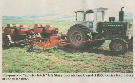 "It lets me bale twice as fast," says Clyde Story, Goldendale, Wash., about his 3-pt. mounted, pto "splitter hitch" that lets him operate two Case-IH small square balers at the same time.