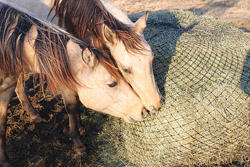 It takes some time for the horses to get used to the hay net. CinchChix suggests having loose hay next to the net until the animals adjust.